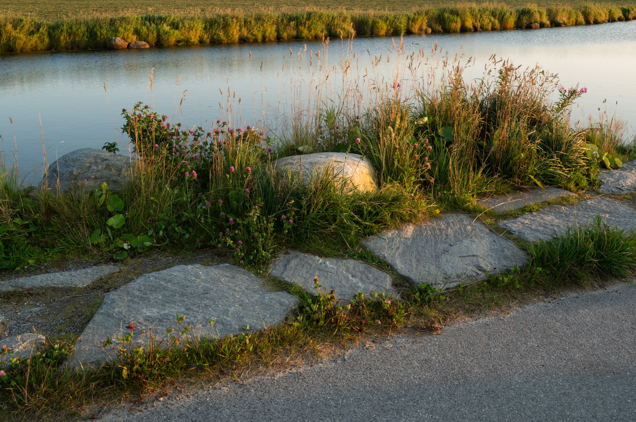 Parkeringsplassen er gressarmert med lokal gressblanding og glir inn i det omkringliggende landskapet. I steinplastringen langs elven er det plantet stedegne stauder fylt inn med stedegne masser for en naturlig revegetering av elvekanten.