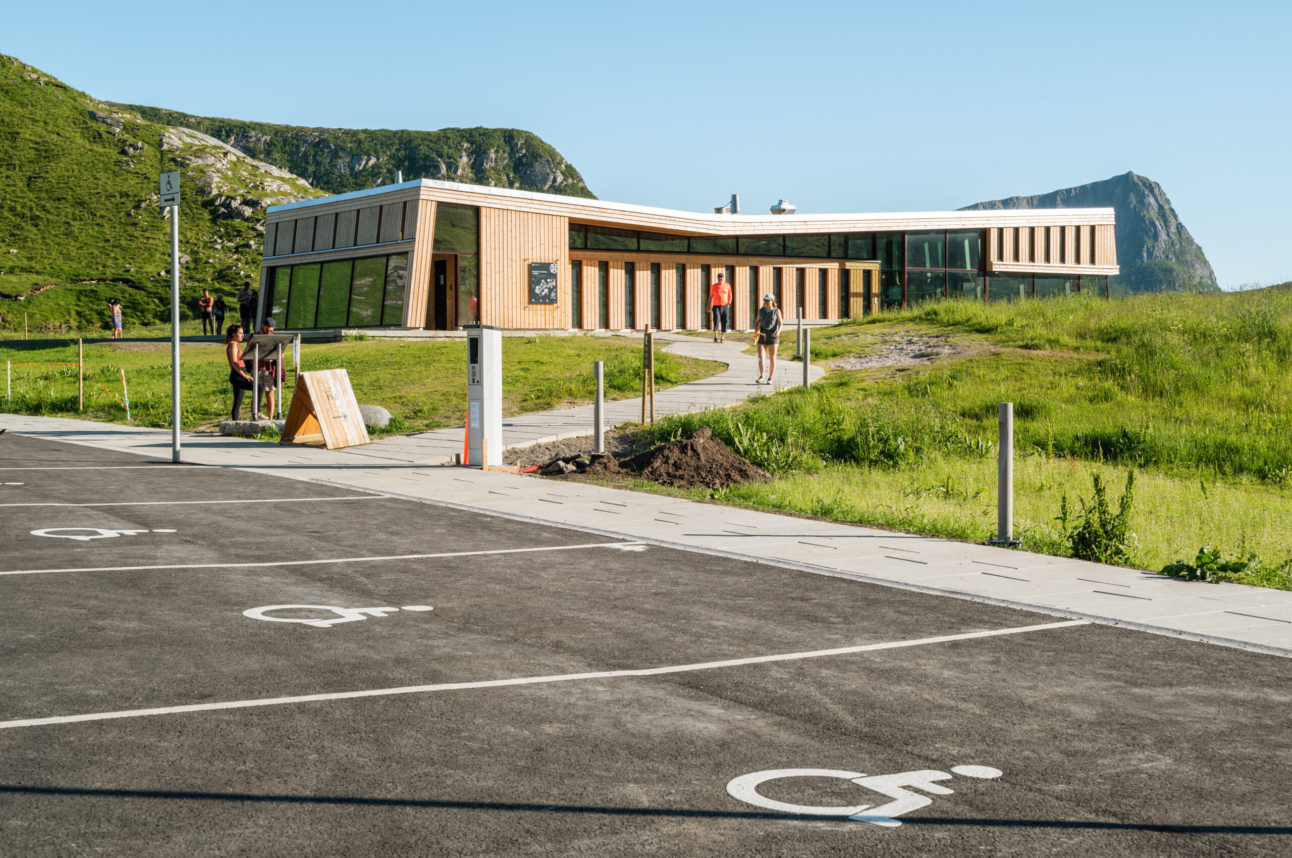 Grindaker har bistått Arne Henriksen Arkitekter med etableringen av ny rasteplass med servicebygg, parkeringsplass, opparbeidede gangveier og istandsetting av landskap.