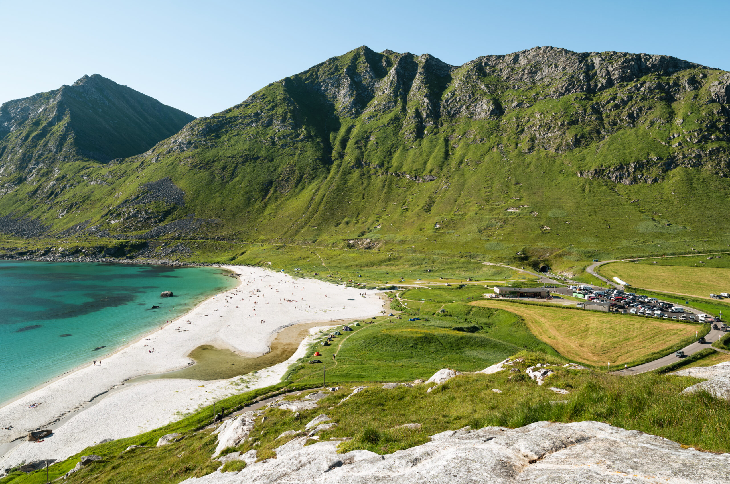 På yttersiden av Vestvågøy i Lofoten ligger Hauklandstranda, omkranset av alpine fjell, gressletter, dyrka mark og Norskehavet mot vest. Hauklandstranda ligger langs en avstikker av Nasjonal turistveg Lofoten, og er et statlig sikret friluftsområde.