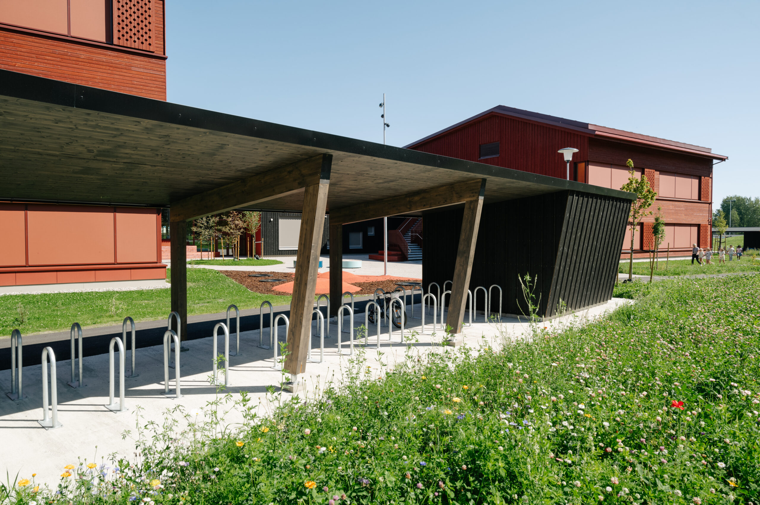 Trinnområdene er lagt mot sør og henvender seg mot tilstrømmingen av elever fra boligområdene rundt. Torgene kobles sammen gjennom en slyngende gangsti som strekker seg rundt hele skolebygget.