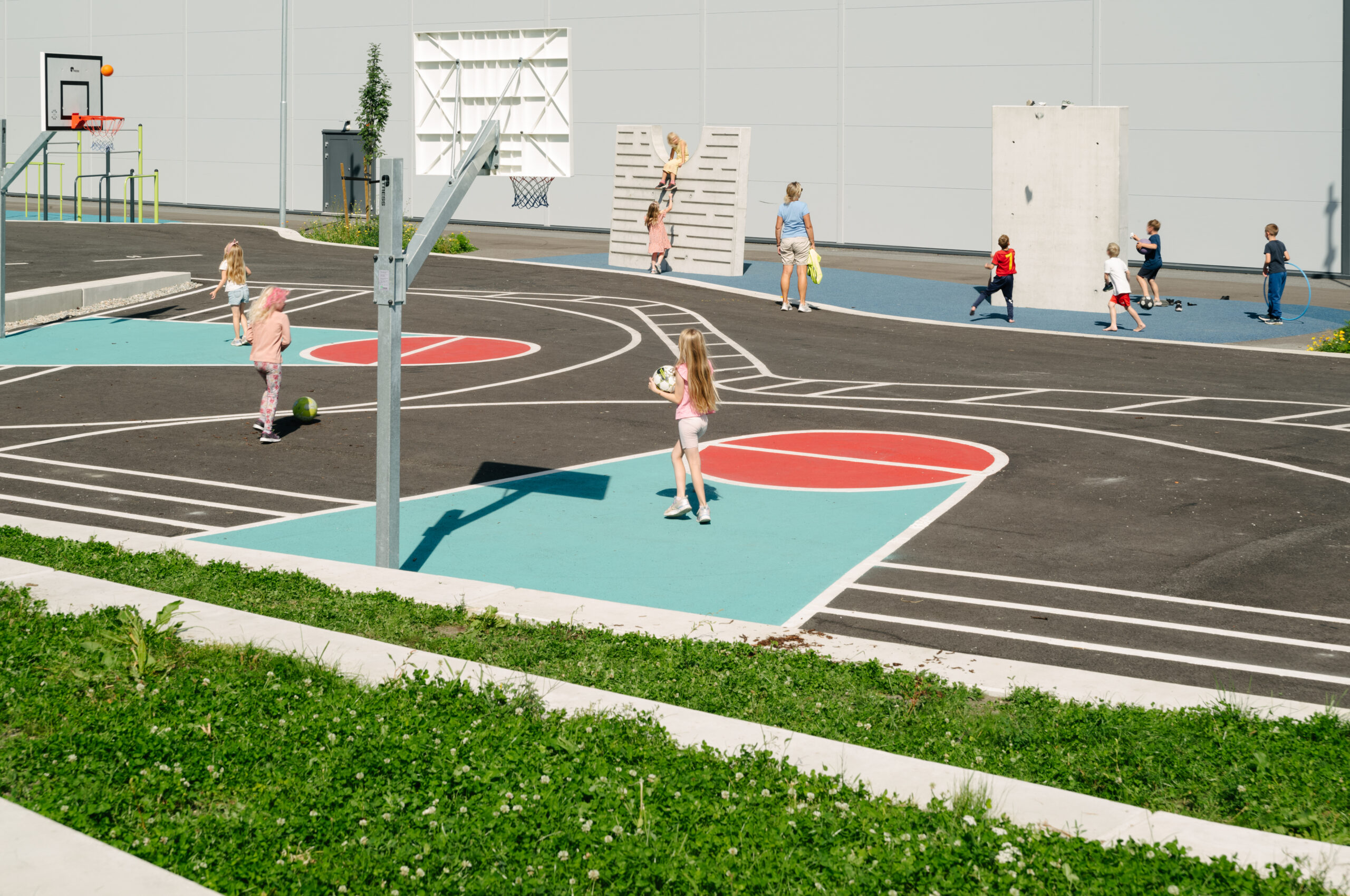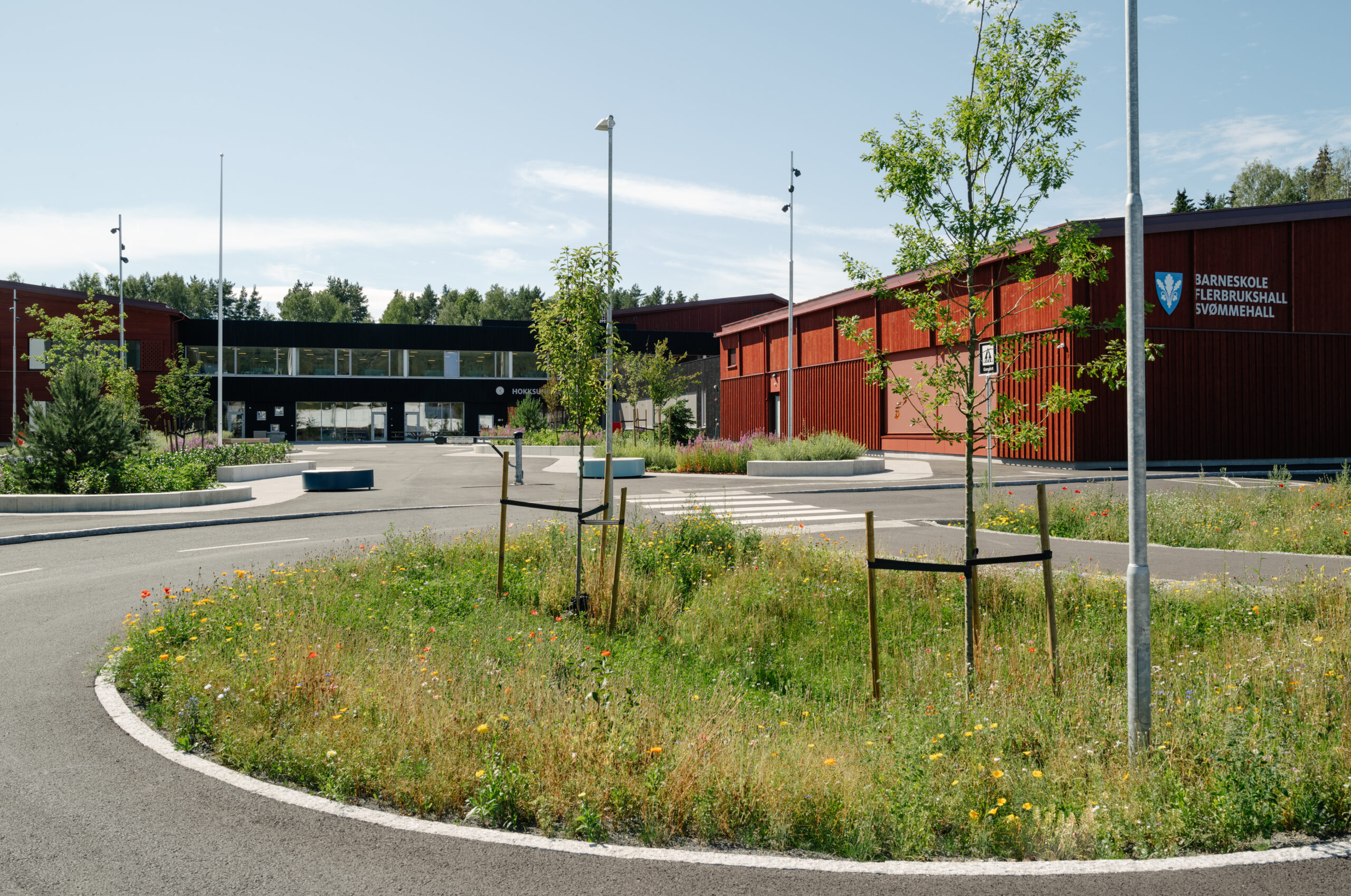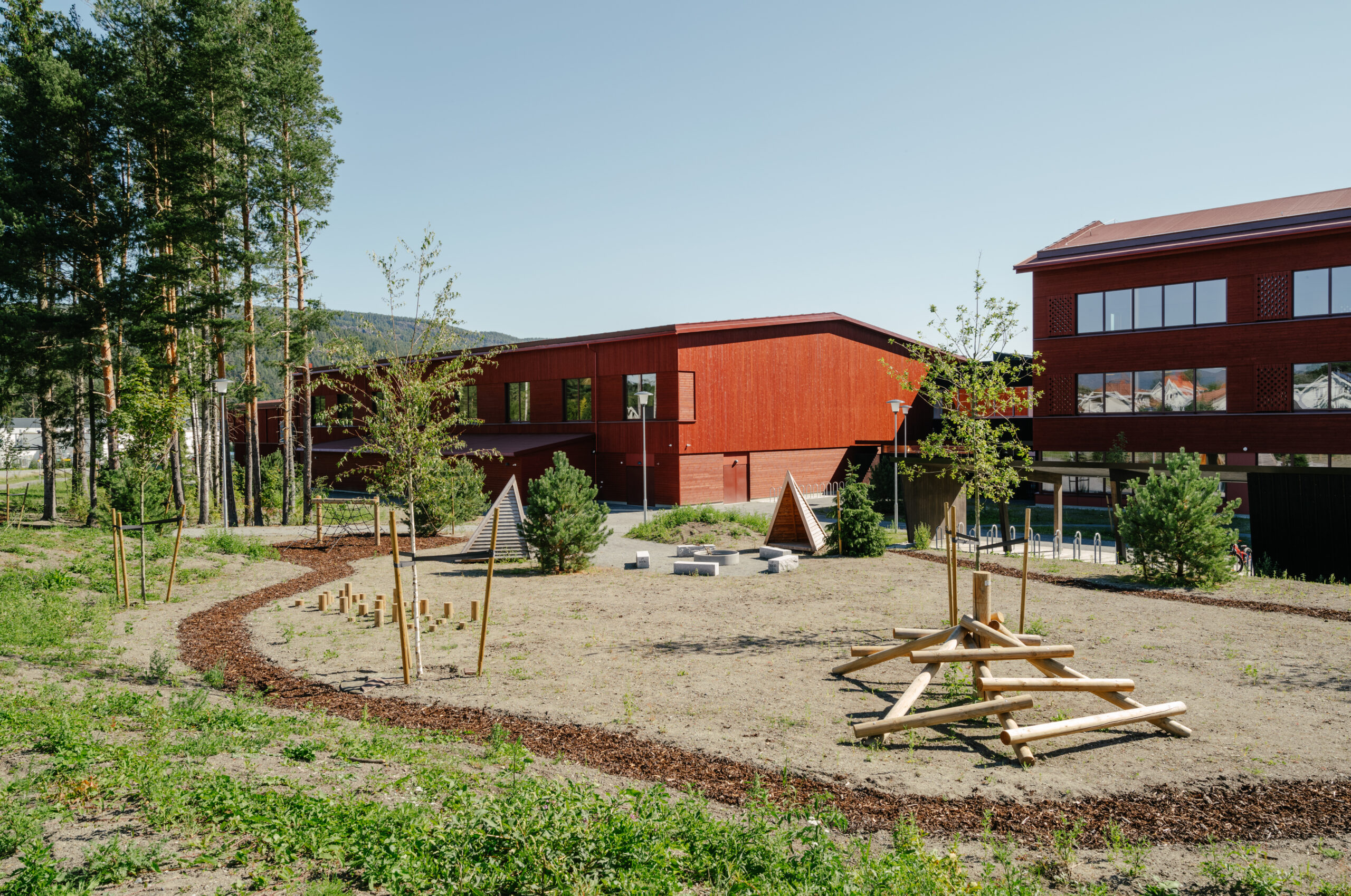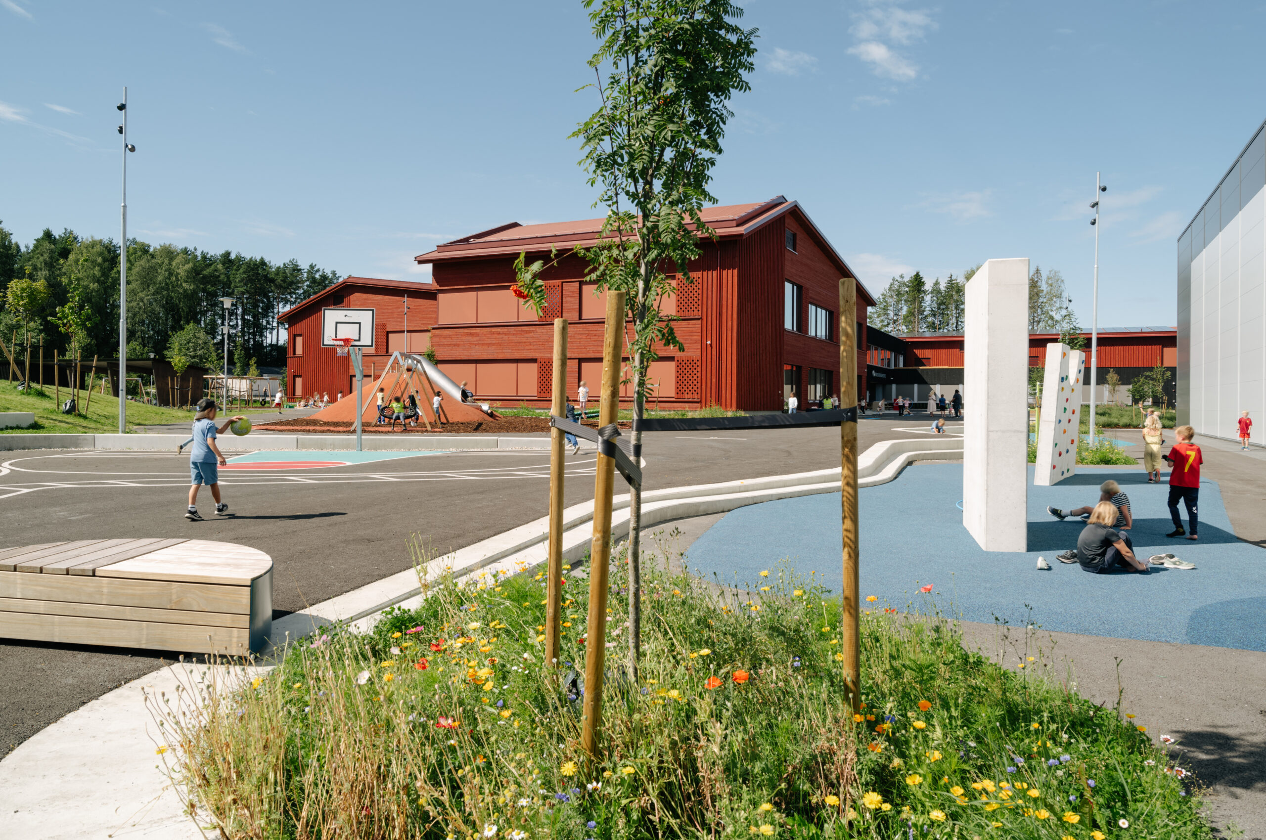 Et viktig premiss for anlegget har vært tilpasning til mangfoldet av skolens brukere, samt tilpasset bruk gjennom hele året. En aktivitetsstripe strekker seg fra parkeringen i nord og ned mot det eksisterende idrett- og friluftsområdet i sør. Her er det programmert med ulike lek- og aktivitetsfunksjoner, som parkour og streetbasket. I vest er det tilrettelagt for mer naturbasert lek, i samsvar med bevaring og styrking av eksisterende skogsområde.