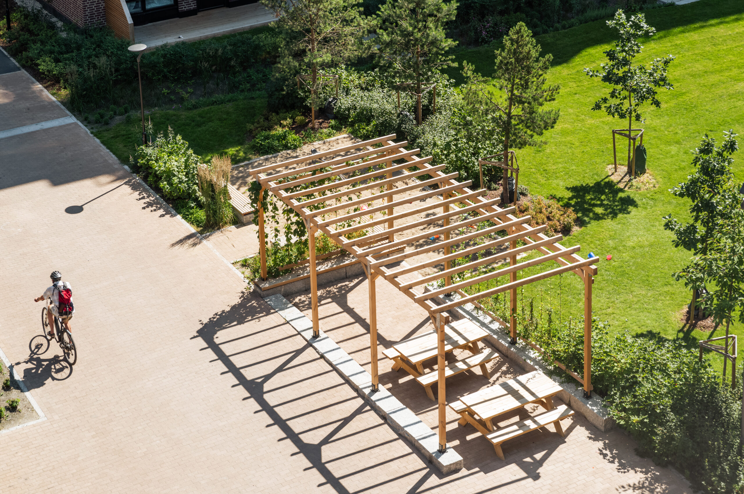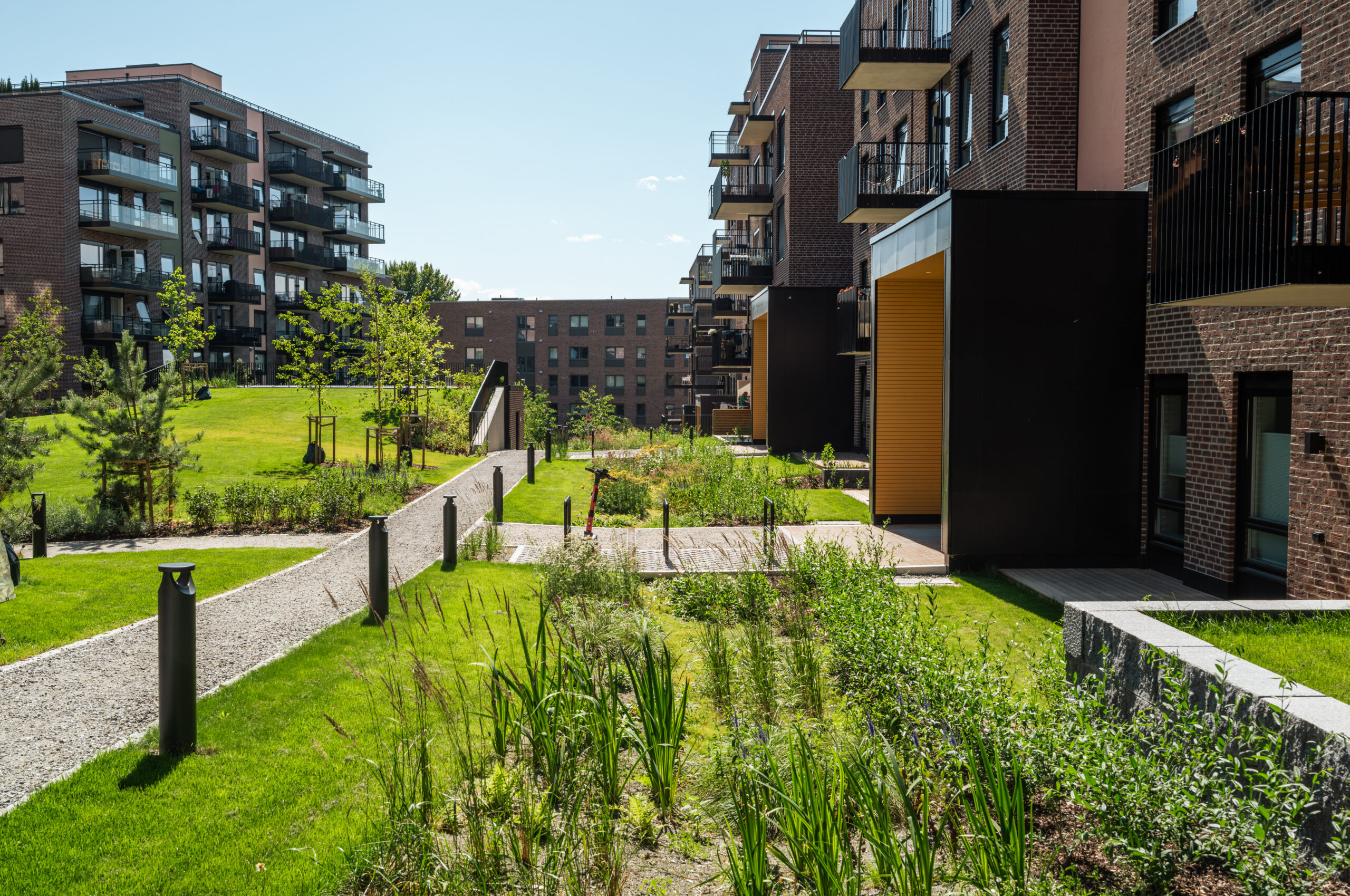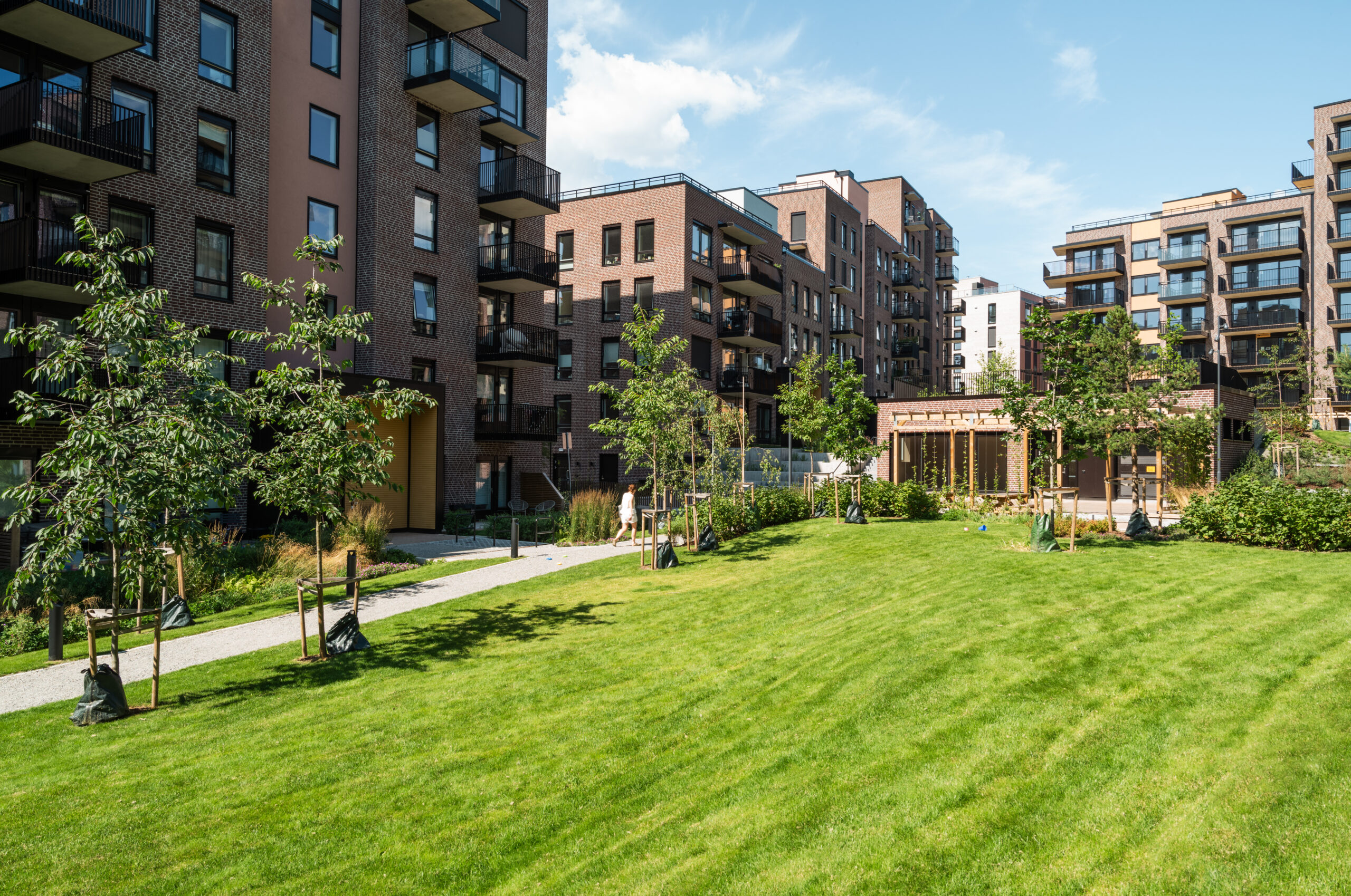 I midten er det parkmessig opparbeidede fellesområder med blant annet gressplener, grupper med trær, lekeplasser og oppholdssoner. Her er det lagt opp til fleksibel bruk og plasskrevende aktivitet. Målet har vært å skape møteplasser og rekreasjonsområder for både beboere og folk i området, og at de skal være mye i bruk.