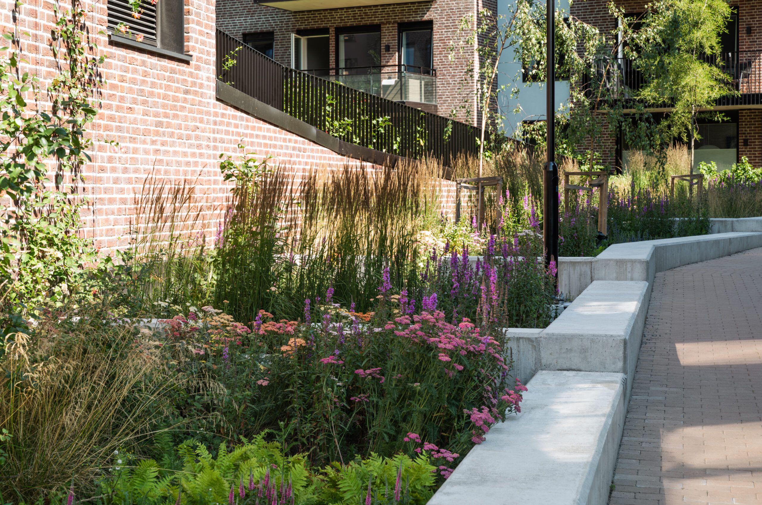Langs hver side av gårdsrommet ligger avlange regnbed, som sammen med buskfelt danner et skille mellom felles og private soner.