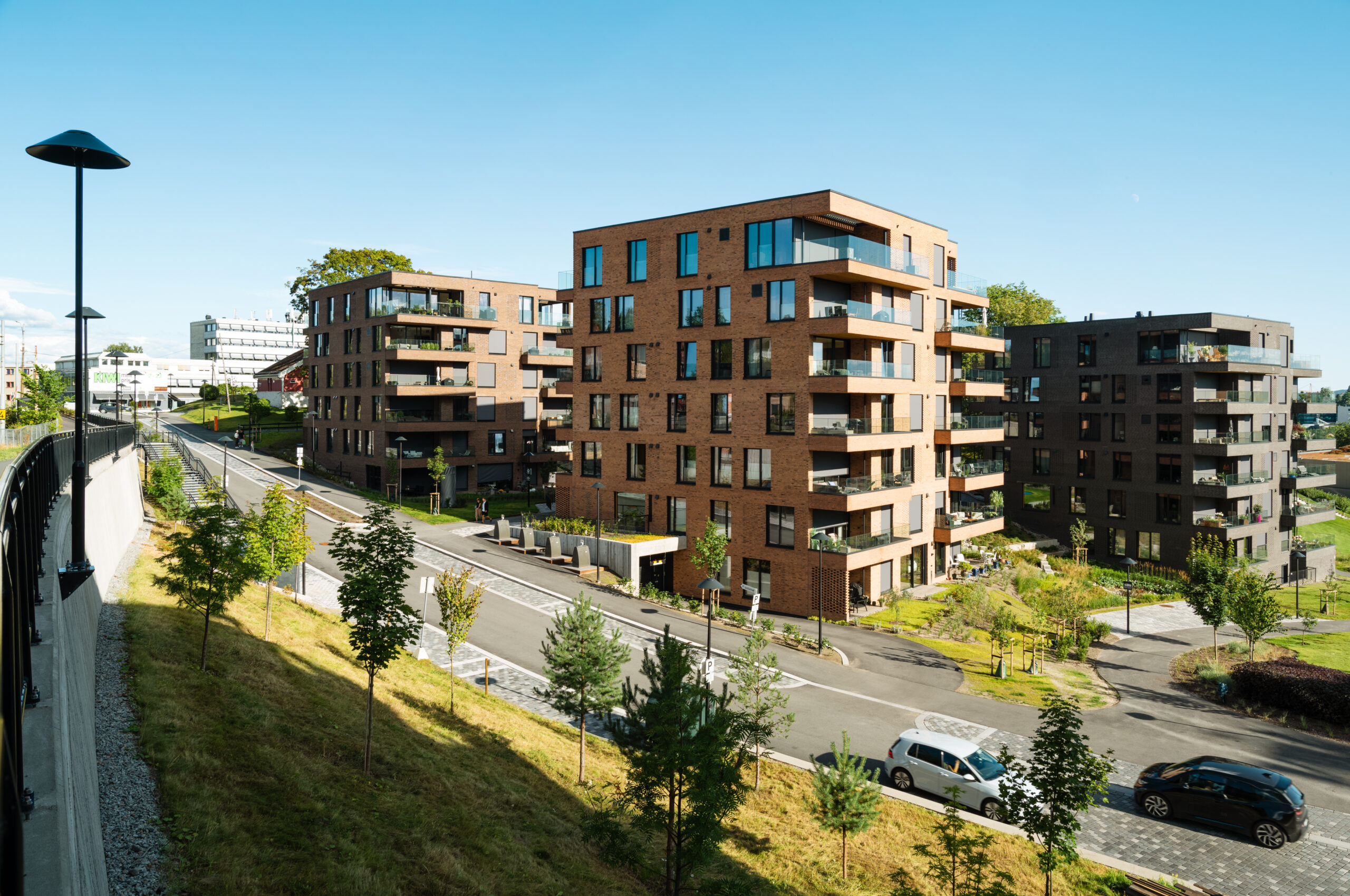 Hovedganglinjer i asfalt kombineres med utvidede felter i storgatestein for å ivareta plass til brann- og redningskjøretøy. Byggene ligger i grøntarealer med stedegne trær, stauder og buskfelt som skaper buffer inn mot de omkringliggende områdene, deriblant de verneverdige “arbeiderboligene” på Lilleaker.