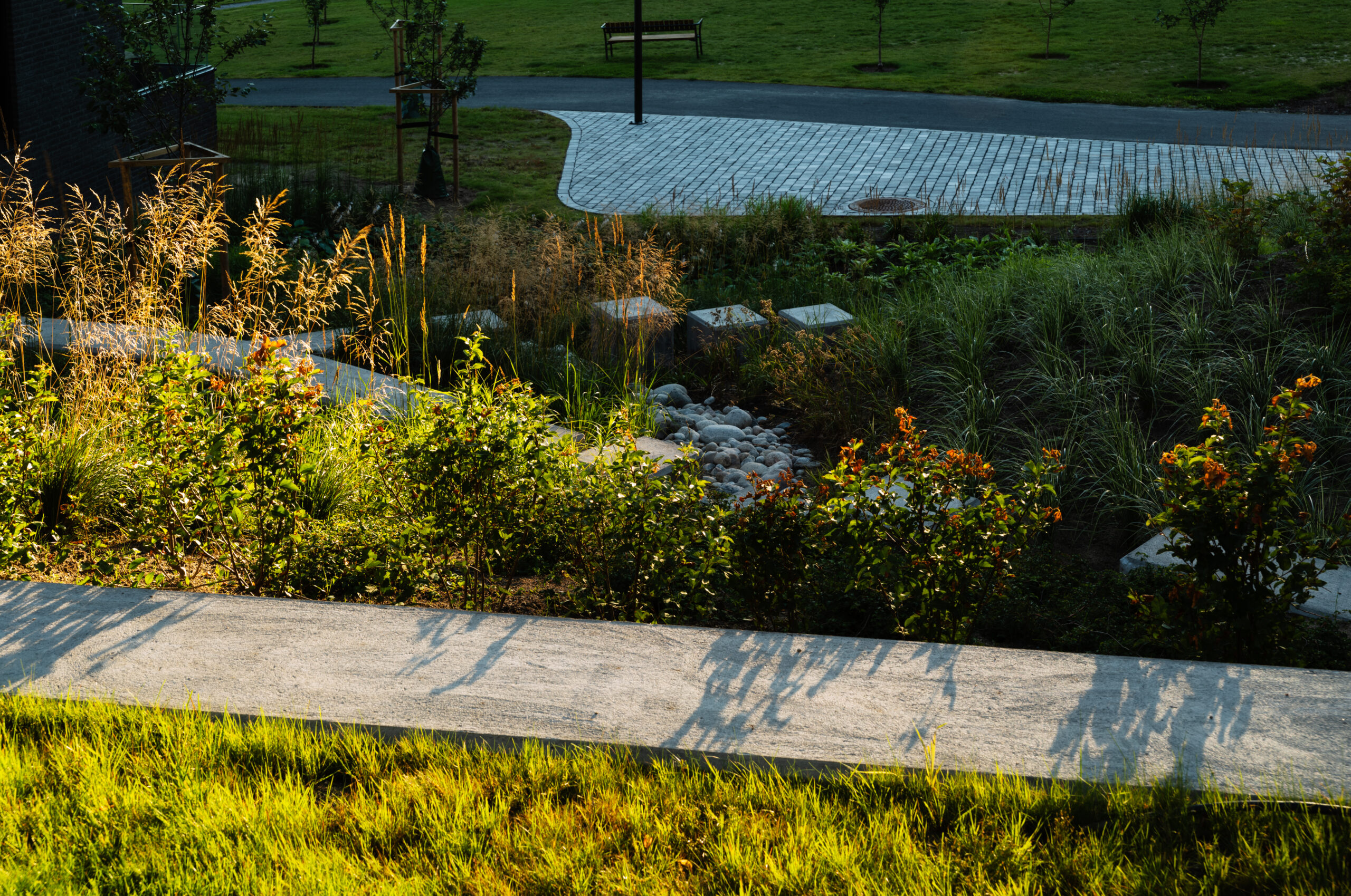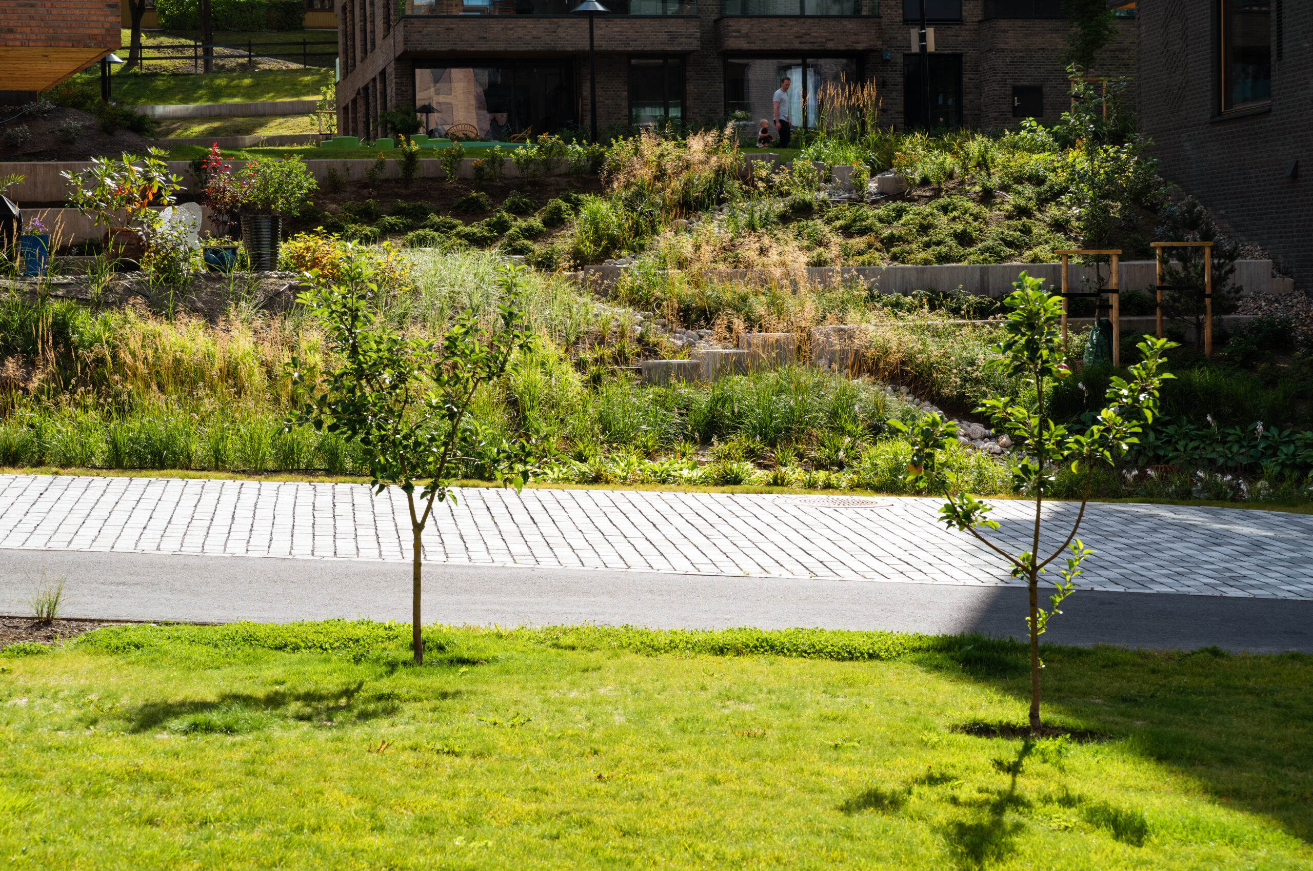 Terrengbehandling med håndtering av overvann har vært sentralt i prosjektet, og alt overvann føres ned til et regnbed plassert nederst ved Mustadparken.