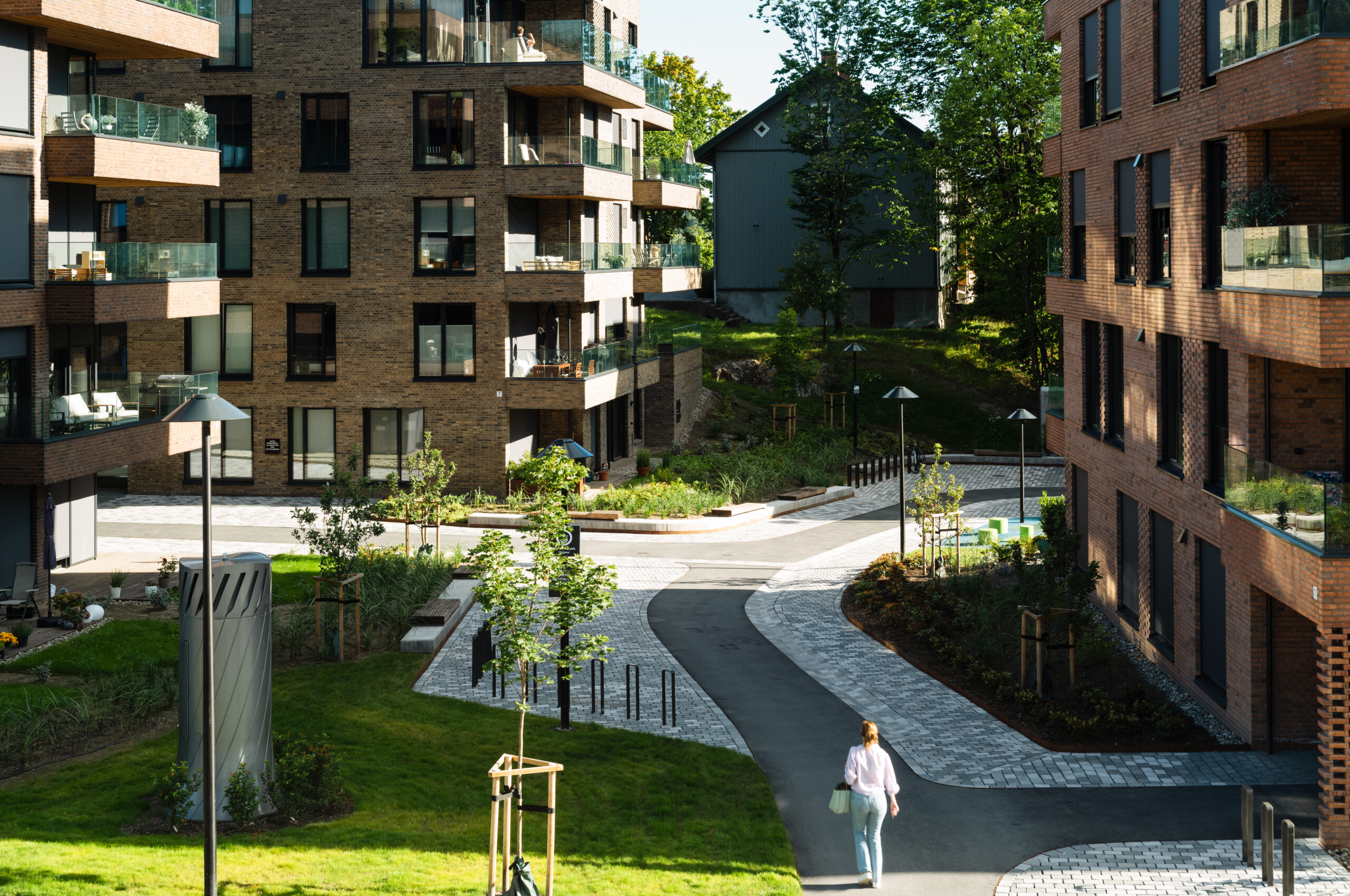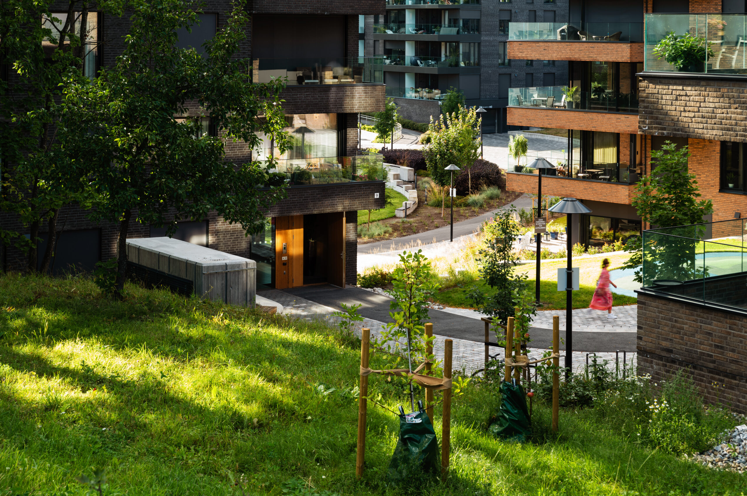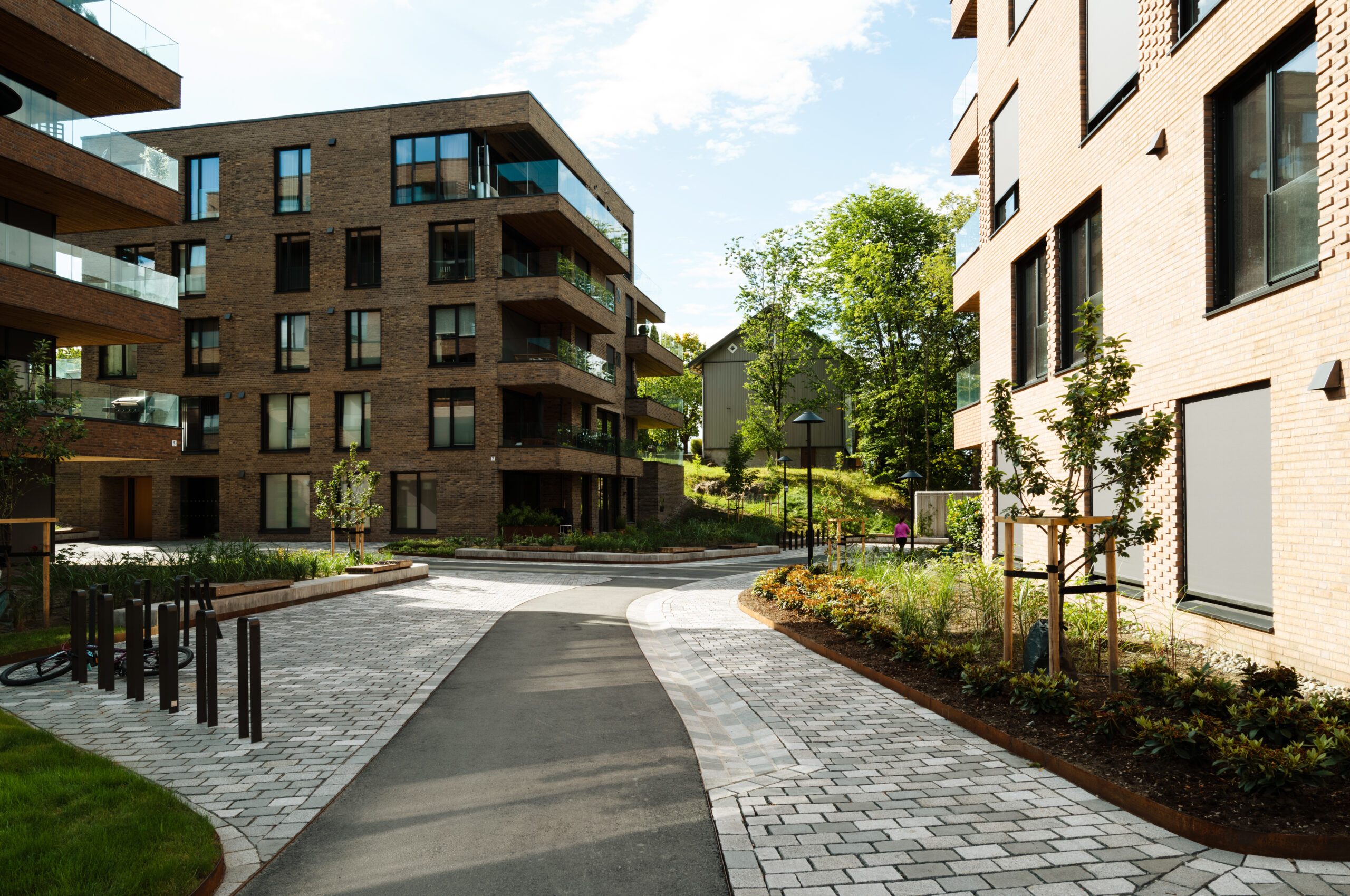 Hovedganglinjer i asfalt kombineres med utvidede felter i storgatestein for å ivareta plass til brann- og redningskjøretøy. Byggene ligger i grøntarealer med stedegne trær, stauder og buskfelt som skaper buffer inn mot de omkringliggende områdene, deriblant de verneverdige “arbeiderboligene” på Lilleaker.