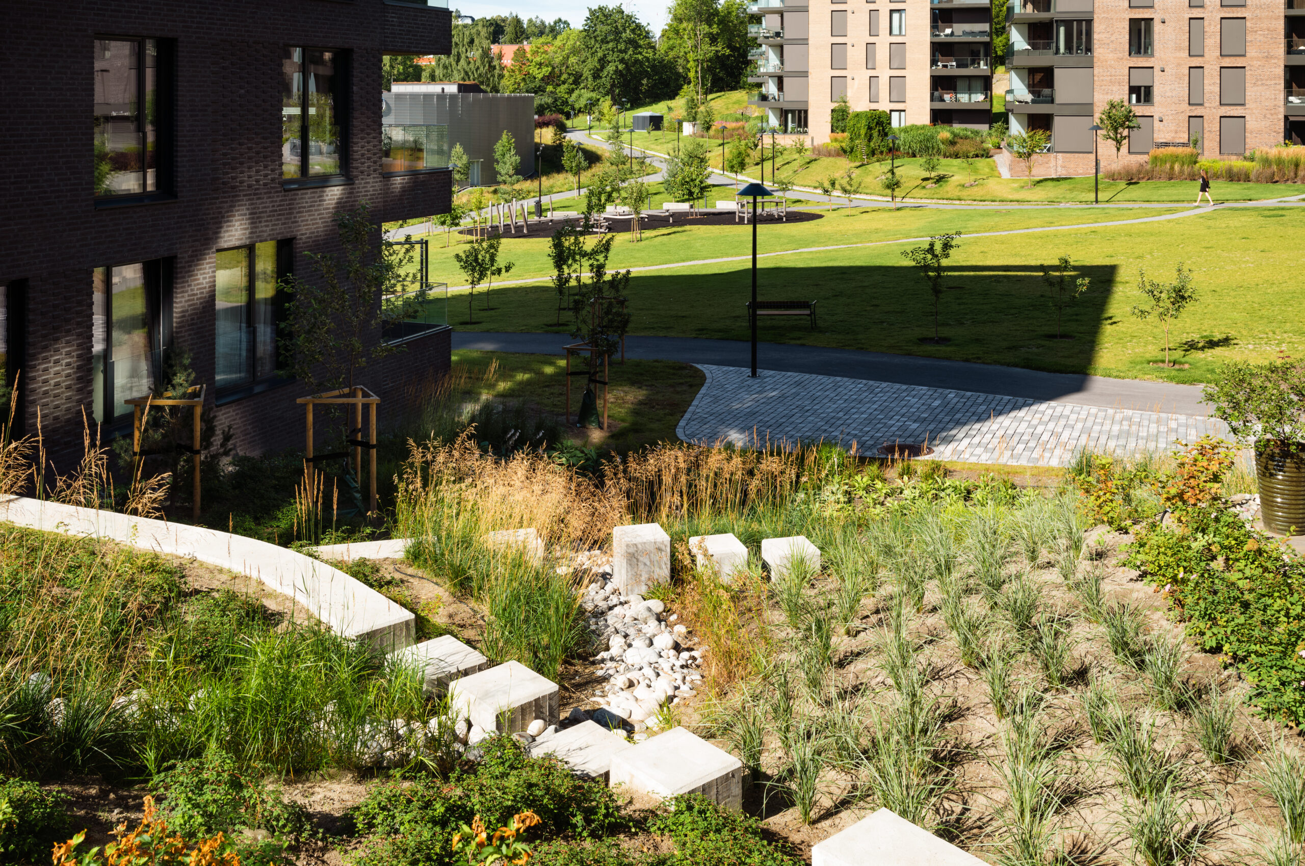 Terrengbehandling med håndtering av overvann har vært sentralt i prosjektet, og alt overvann føres ned til et regnbed plassert nederst ved Mustadparken.