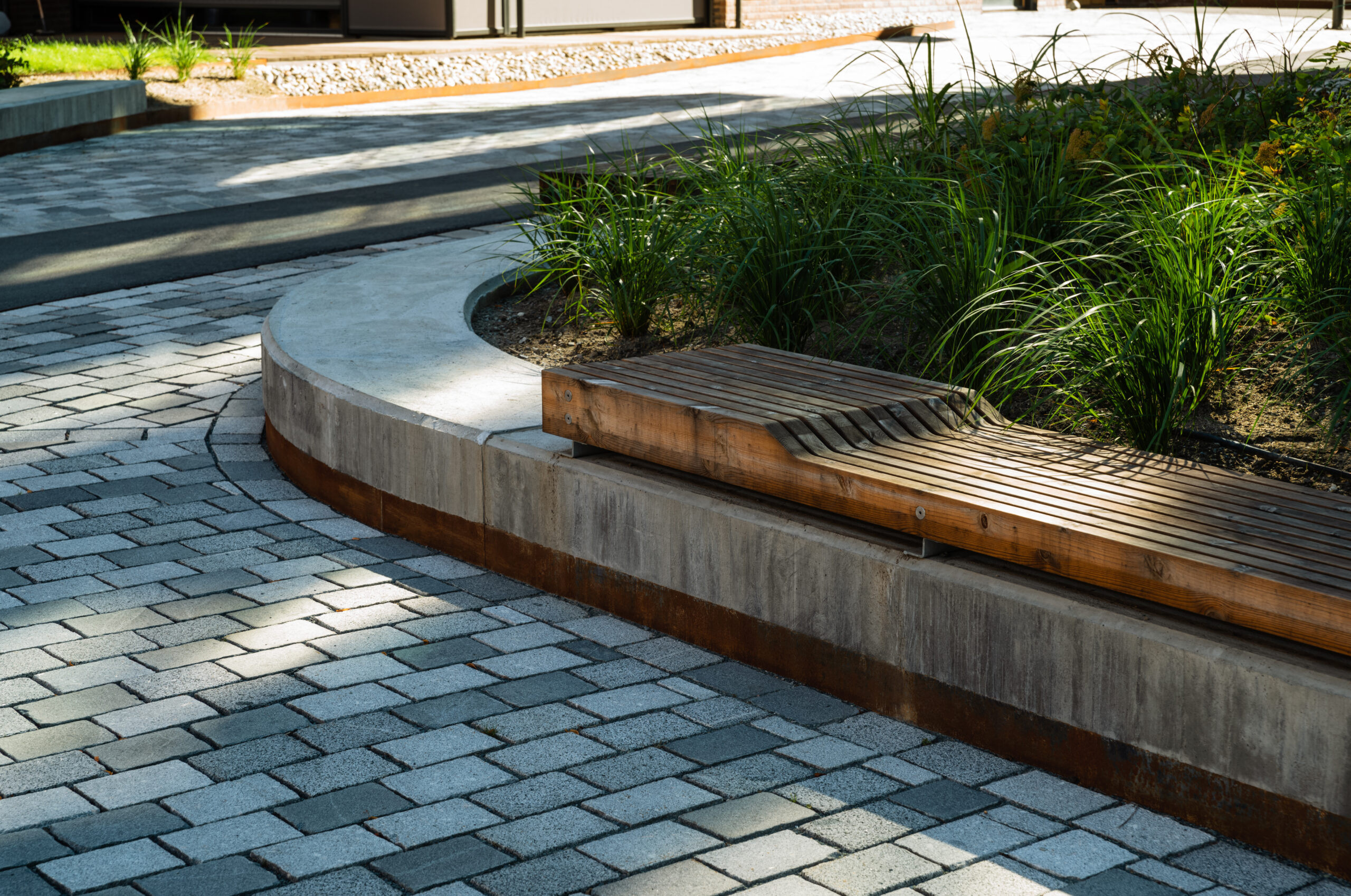 Kanter av betong og fluktende stålkanter tar opp høydeforskjeller i terrenget og skaper oppholdssoner for beboere langs de åpne plassene.