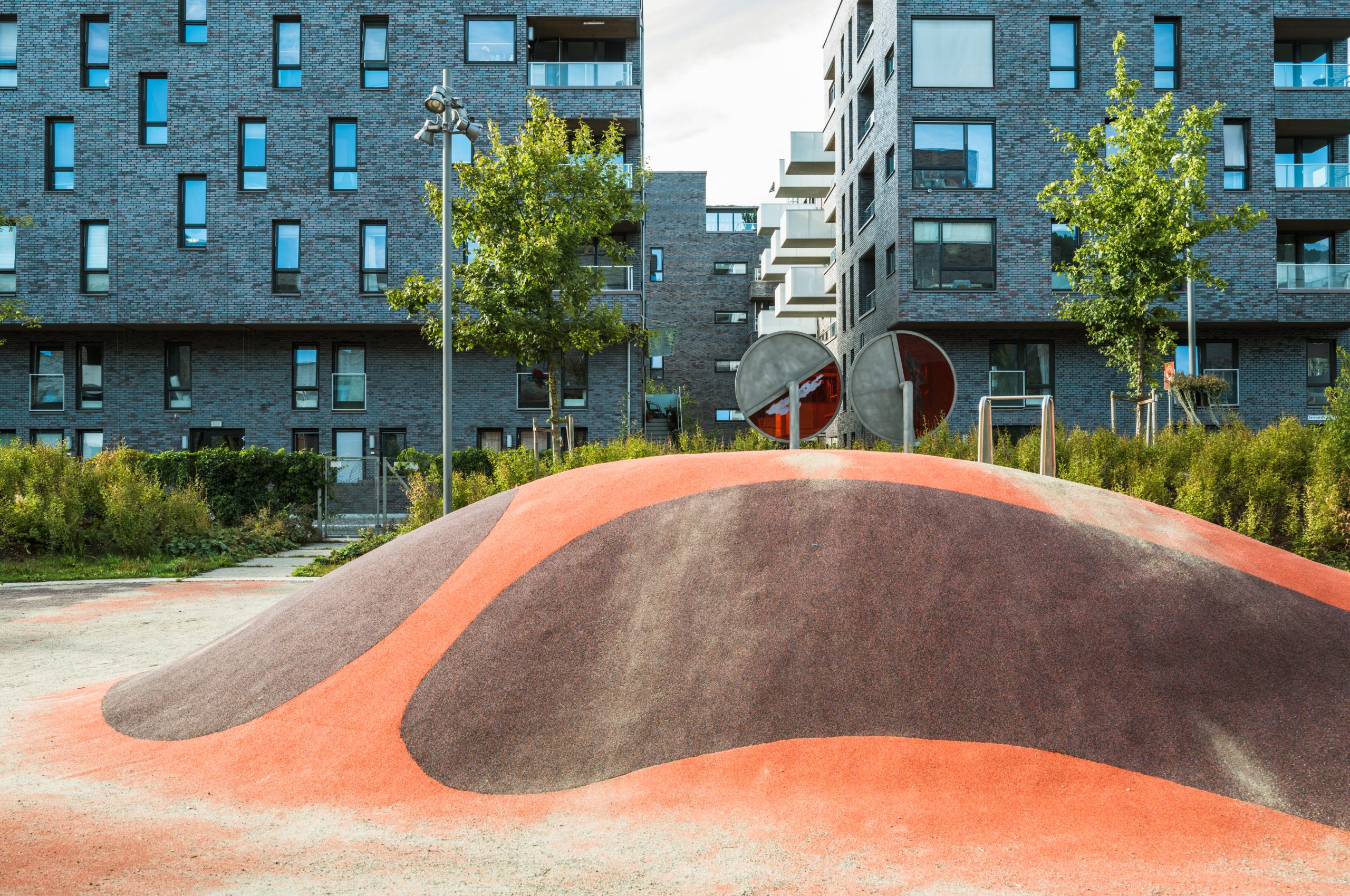 Fargebruk og geometri drar referanser til geologiens historie og naturen i Oslofjorden: Sand, vann, lava og bergformasjoner.